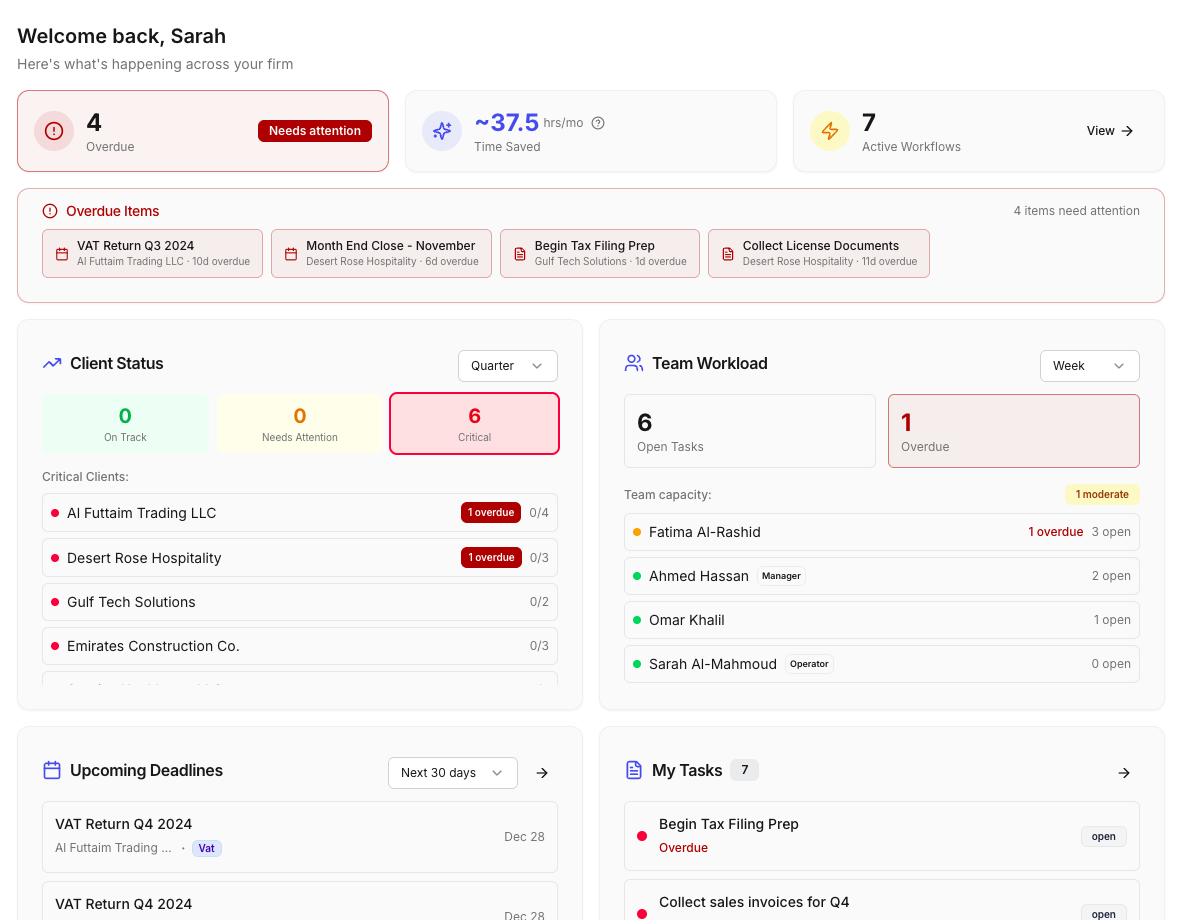Asana and Trello aren't built for UAE compliance workflows or client-specific deadlines.