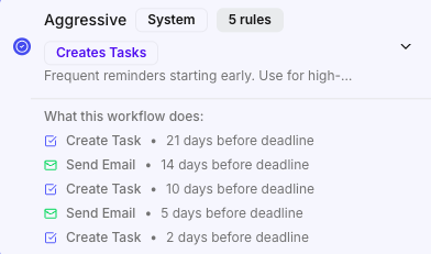 Pick a Workflow template (simple, standard, aggressive, thorough) or build your own. Decide when tasks and emails should go out before and after each important date.